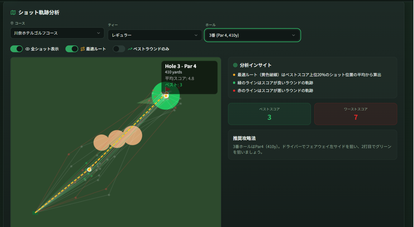 たとえば、私は自分のホームコースの17番ロングホールで、「どのルートならばダボを叩かずボギー以下で回れるのか」を知りたい。 ガーミンのデータには、その答えが眠っているはずだ。実はティーショットを飛ばさない方が良いのではないか、定石は左狙いだけど自身の飛距離の場合は右から攻めた方が良いのではないか。しかし、純正アプリでその傾向を掴もうとするのは、過去のスコアカードや該当ホールを1つ1つクリックしなければならないという苦行である。